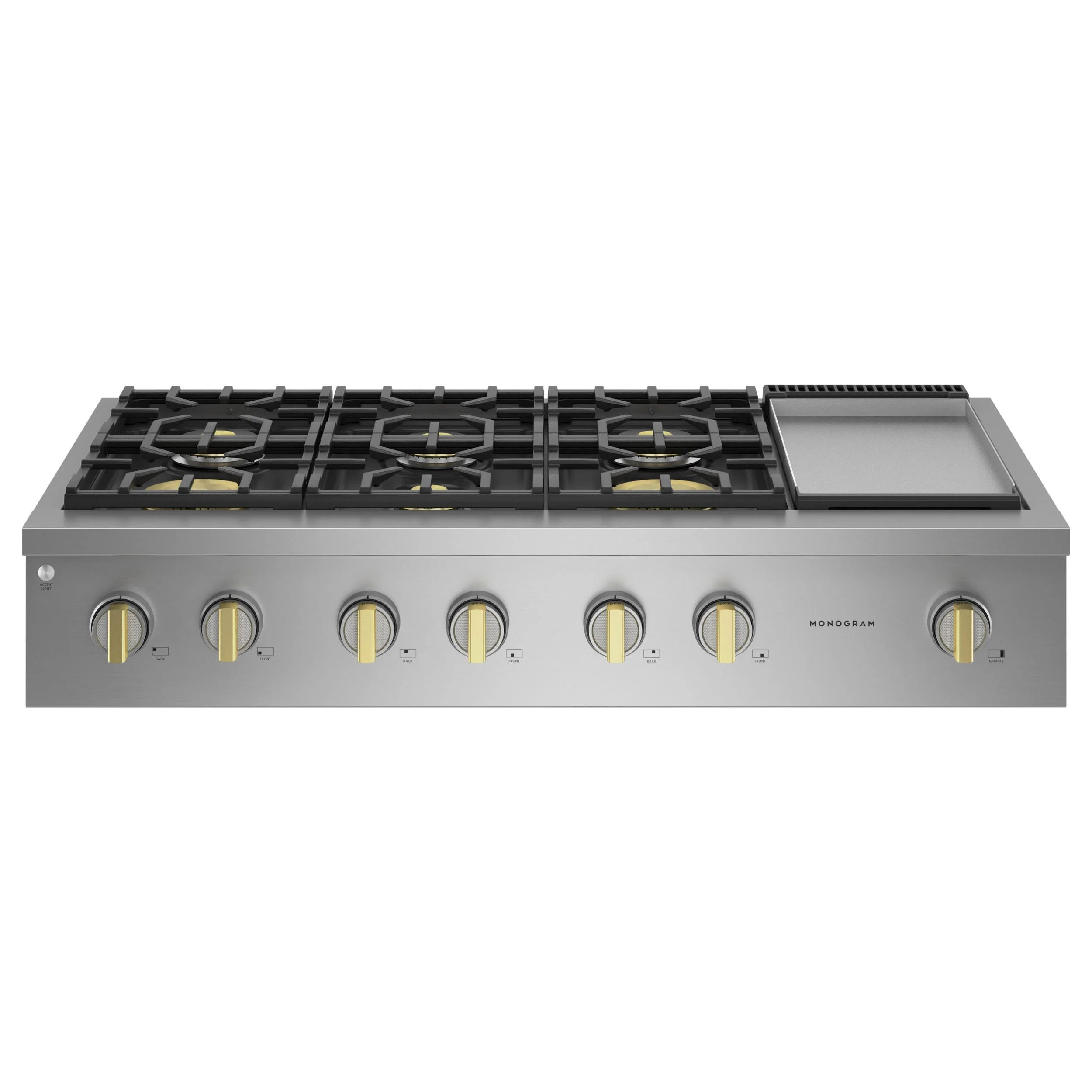 Monogram 48" Professional Gas Rangetop with 6 Burners and Griddle (Natural Gas). Delivering exceptional cooking flexibility, the two 23,000-BTU multi-ring brass burners and dual-stack burners offer a range of heat settings, from gentle simmer to intense flame. The versatile griddle delivers 18,000 BTUs of cooking power, allowing fast and consistent heating across the entire cooking surface.